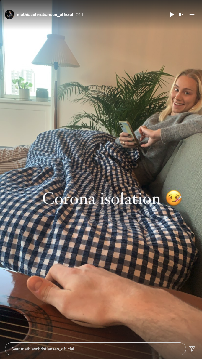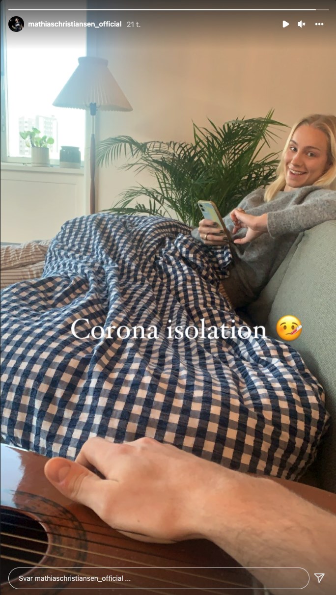 I en story på instagram kan man se Mathias Christiansen bruge tiden i coronaisolation med at spille guitar for kæresten og mixeddoublemakkeren Alexandra Bøje, som han bor sammen med i København. Screenshot fra instagram