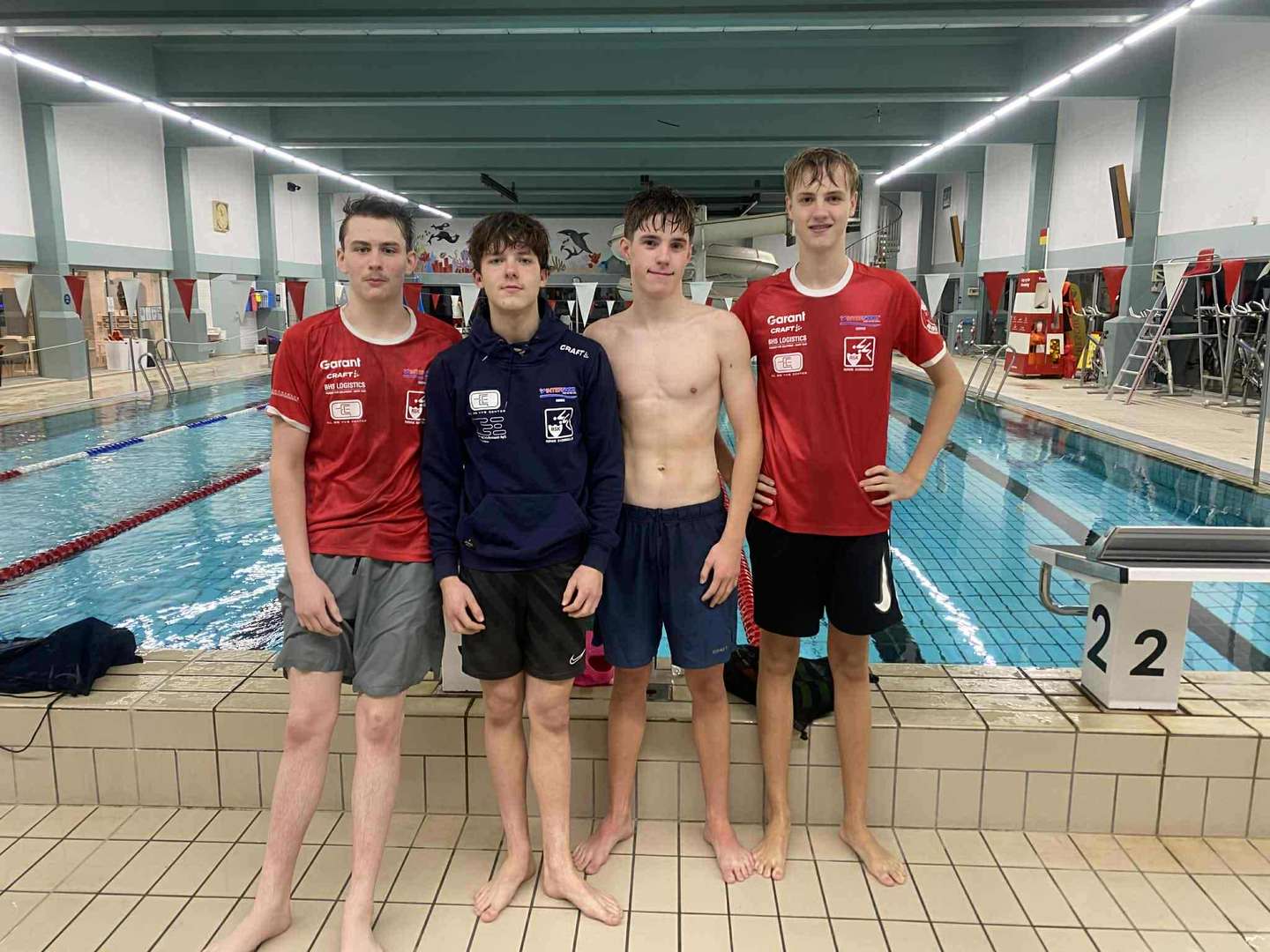 Fra venstre ses Filip Nielsen, Vitus Vilsholm, Tobias Ipsen og Bertram Hallberg, som satte nye bornholmsk juniorrekord. De svømmede følgende: Første tur: Filip Nielsen 2.08,73. Anden tur: Bertram Halberg 2.19,96. Tredje tur: Vitus Vilsholm 2.07,06. Fjerde tur: Tobias Ipsen 2.10,46. Privatfoto