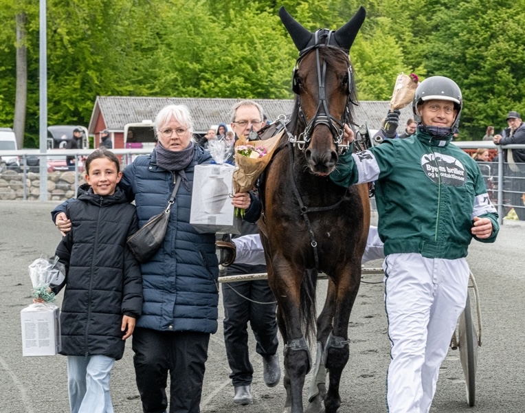 Hele familien Mogensen står sammen om Inter Flamingo. Her ses Tonni K. Mogensen sammen med hustruen Pernille og datteren Sara efter en af de hestens mange sejre på Bornholms Brand Park. Foto: Torben Ager