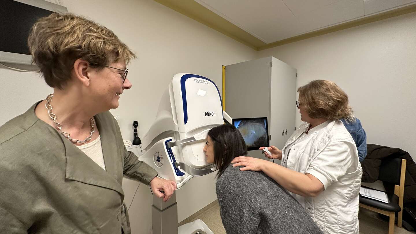 Hospitalsdirektør Annemarie Hellebek, overlæge Asrin Rasul og sygeplejerske Mari-Ann Nexø tog Bornholms Hospitals nye Widefield-kamera i brug ved en reception mandag eftermiddag. Foto: Bornholms Hospital
