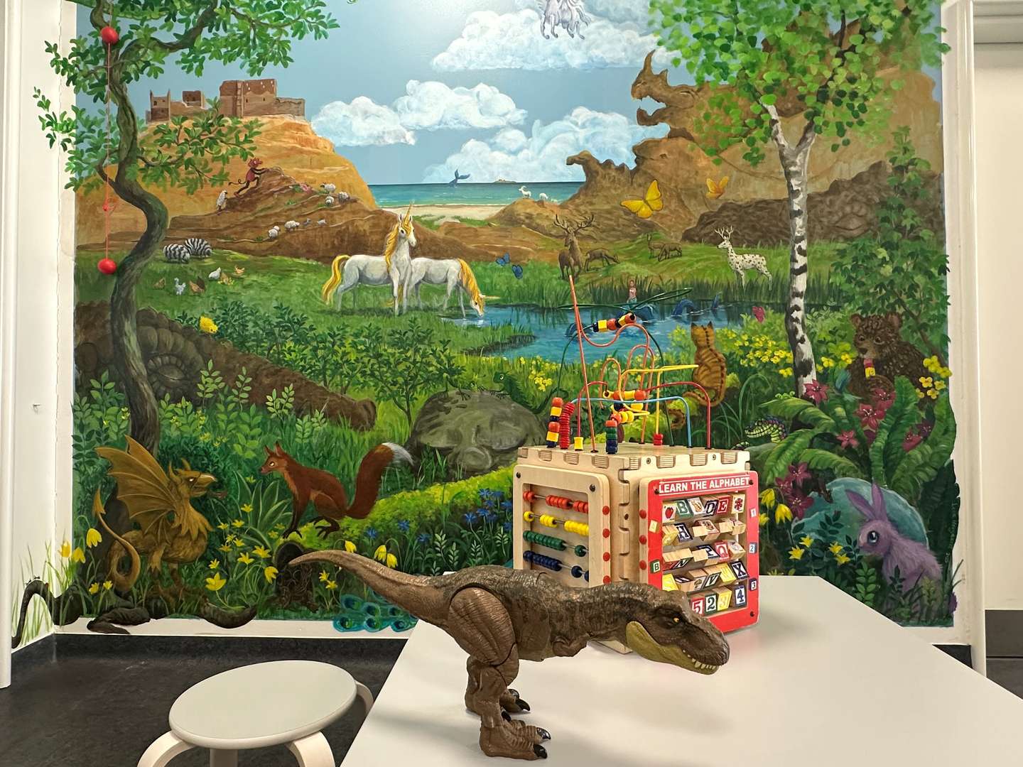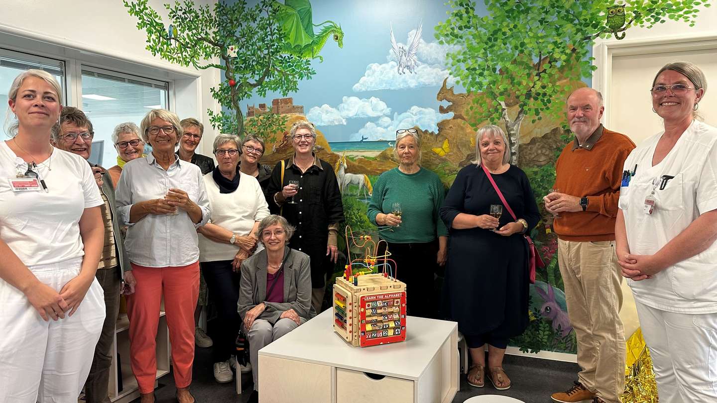 – Fantasien får frit spil i Lena Heegaards vægmaleri, der omfavner vores nye børnehjørne i venteværelset i akutmodtagelsen. Hvis man kigger godt efter, gemmer der sig for eksempel en edderkop med kaninører. Et specifikt ønske fra et af de børn, der sad i venteværelse, da Lena gik og malede. En Filur-is har også sneget sig med i favnen på Bamsebjørn som symbol for, at alle børn, der må få is efter behandling, får tilbudt en Filur.