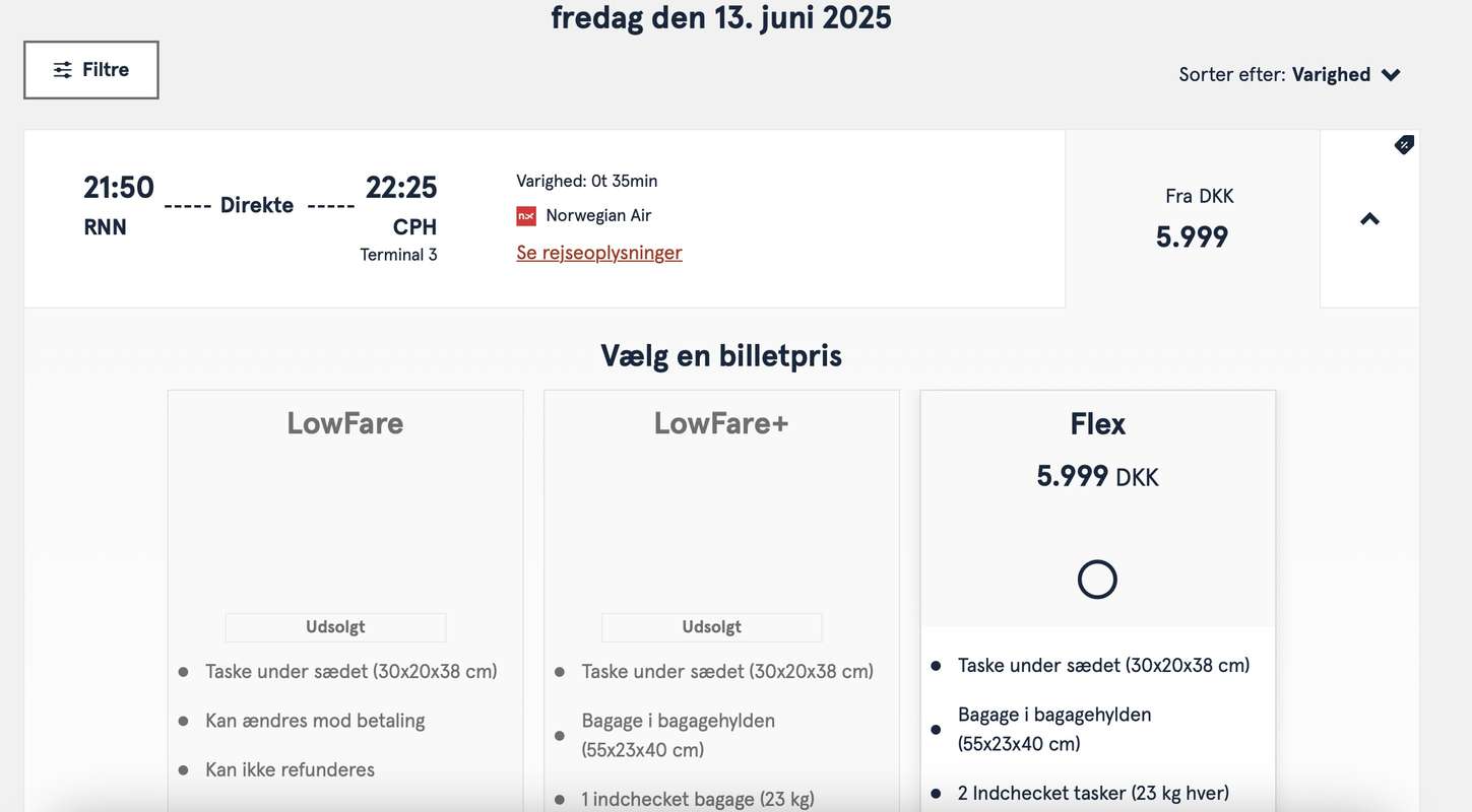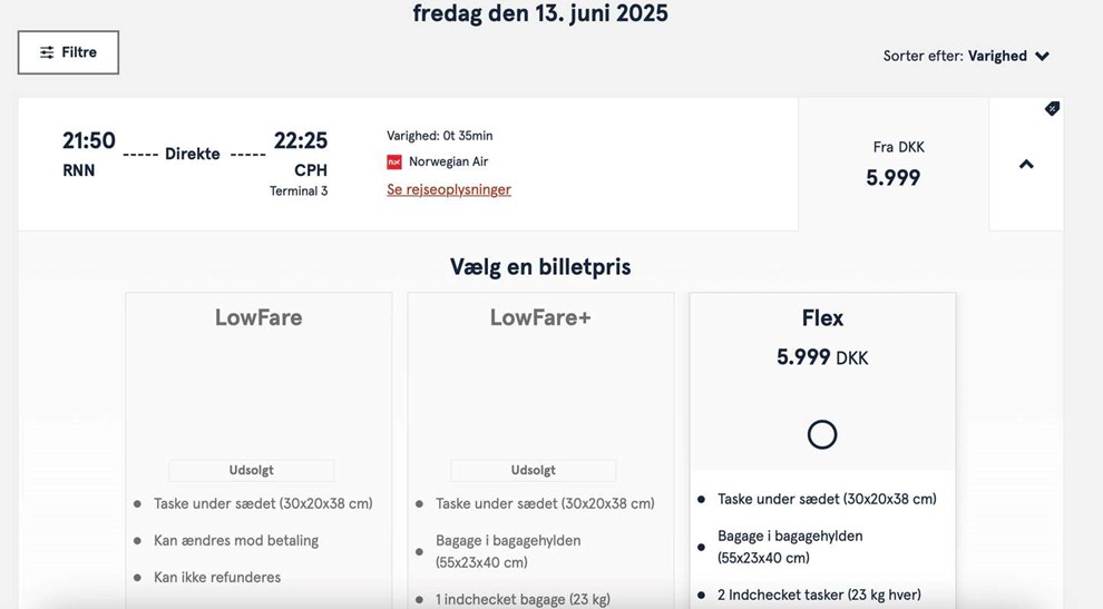 Flyselskabet DAT flyver på ruten året rundt. Fredag var alt udsolgt i retning mod København, da Tidende gik på jagt i selskabets bookingsystemer, mens der lørdag var ledige pladser på alle afgange. Her var der enkelte billetter i prisniveauet 1.145 kroner til 1.515 kroner, mens billetterne til de fleste afgange stod til både 2.375 kroner og 2.995 kroner.