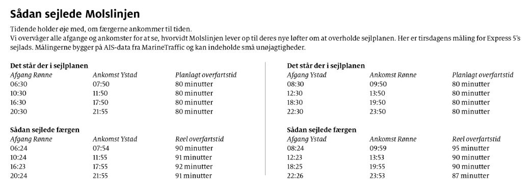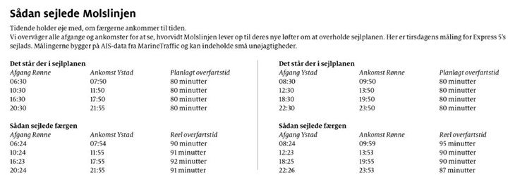 Tidende har løbende målt på, hvornår Express 5 afgår og anløber havnene. Avisen har dokumenteret, at overfartstiden i hovedreglen ligger på omkring 90 minutter, fordi rederiet både sejler før aftalt tid og ankommer senere. Tirsdagens sejltider kan læses i tabellen.